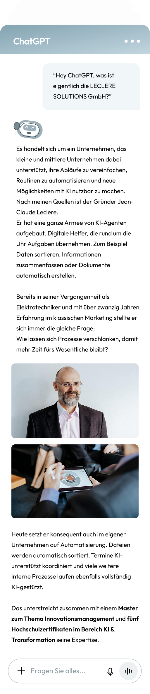 Mit LECLERE SOLUTIONS machen wir sichtbar, wo in Ihrem Unternehmen aktuell Zeit verloren geht, und zeigen, wie diese Aufgaben durch vereinfachte Abläufe, klare Arbeitsmethoden und KI-Automatisierungen optimiert werden können.