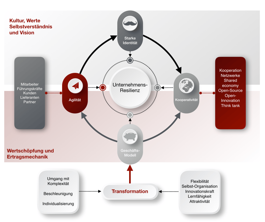 Die Notwendigkeit der Veränderung und der Anpassung an eine neue Ordnung ist allgegenwärtig und zunehmend in unseren Alltag sichtbar. Dennoch stellt sich die Frage auf welche Ebene Sie stattfinden soll und kann. Da die Themen vielfältig sind, kann es nicht nur in einem Bereich verankert werden, also nicht nur auf Strategie, Prozesse, Digitalisierung oder Organisationsform. Die Antwort ist vielsichtig und komplex. Neue Methoden und Instrumenten müssten her, um Unternehmen eine Anpassung an die kommenden Zeiten zu ermöglichen, denn eine Unternehmensverwandlung ist notwendig, wenn Unternehmen diese Zeit der disruptiven Veränderungen überleben wollen.