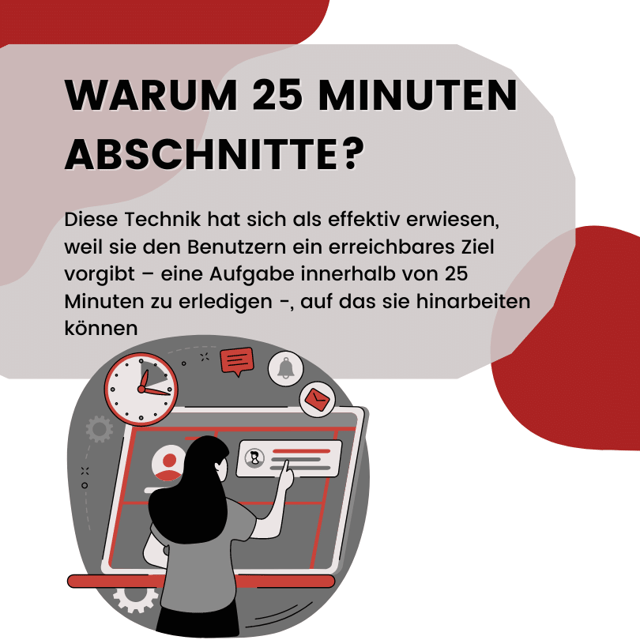 Diese Technik hat sich als effektiv erwiesen, weil sie den Benutzern ein erreichbares Ziel vorgibt – eine Aufgabe innerhalb von 25 Minuten zu erledigen -, auf das sie hinarbeiten können, ohne von ihrem Arbeitspensum überwältigt oder entmutigt zu werden.