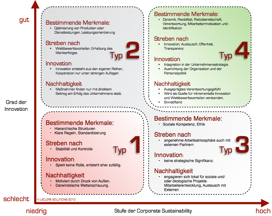Das Modell differenziert vier Unternehmenstypen, die sich in einer Matrix mit den Axen der Innovationsfähigkeit und der Corporate Sustainability einordnen lassen (siehe Grafik). Mit der Zeit hat sich diese Einteilung verfestigt und wurde verfeinert.