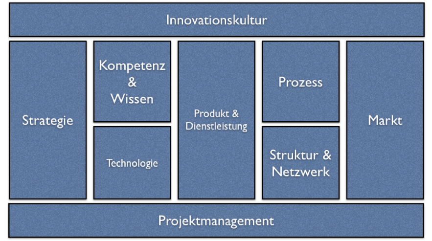 Die Innovationsfaktoren wurden aus der Arbeit des Fraunhofer Instituts als Basis genommen. Dabei definiert das Fraunhofer-Institut für Arbeitswirtschaft und Organisation (IAO) neun Gestaltungsfelder für Innovation (Kirner et al., 2007).